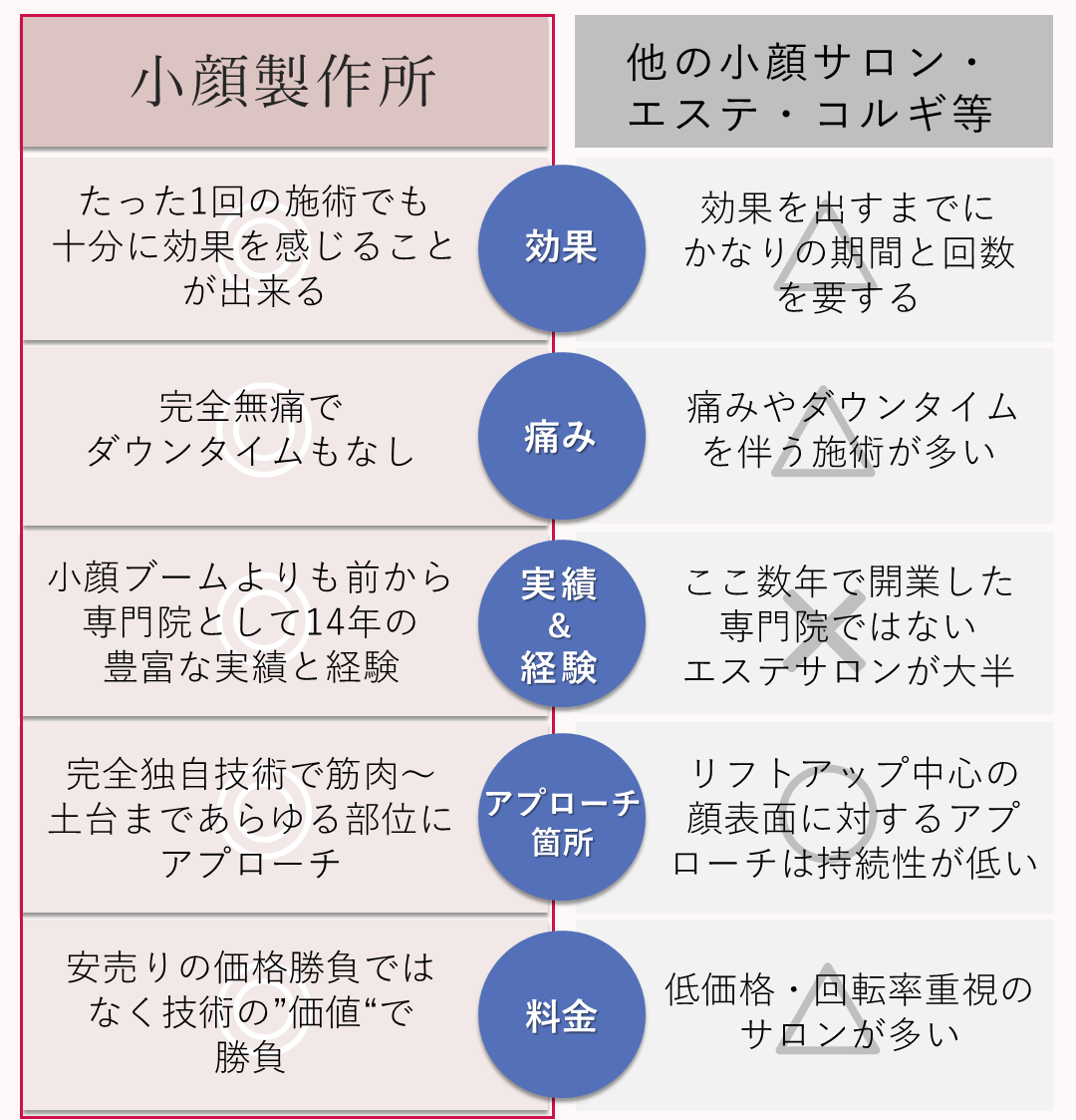 多くのサロンが未だに法令違反をし「戻らない」「半永久的」「小顔になる」等の表現をしておりますが、当サロンは法令にのっとって運営しておりますので、表現は差し控えさせていただいております。しかし、今まで13年お客様に施術をさせていただいておりますが、多くのお客様に実感しておりますし、効果がすぐに戻ってしまったとのお声は頂いておりません。多くをお伝えする事はできませんが、その辺りはお察しいただければと思います。