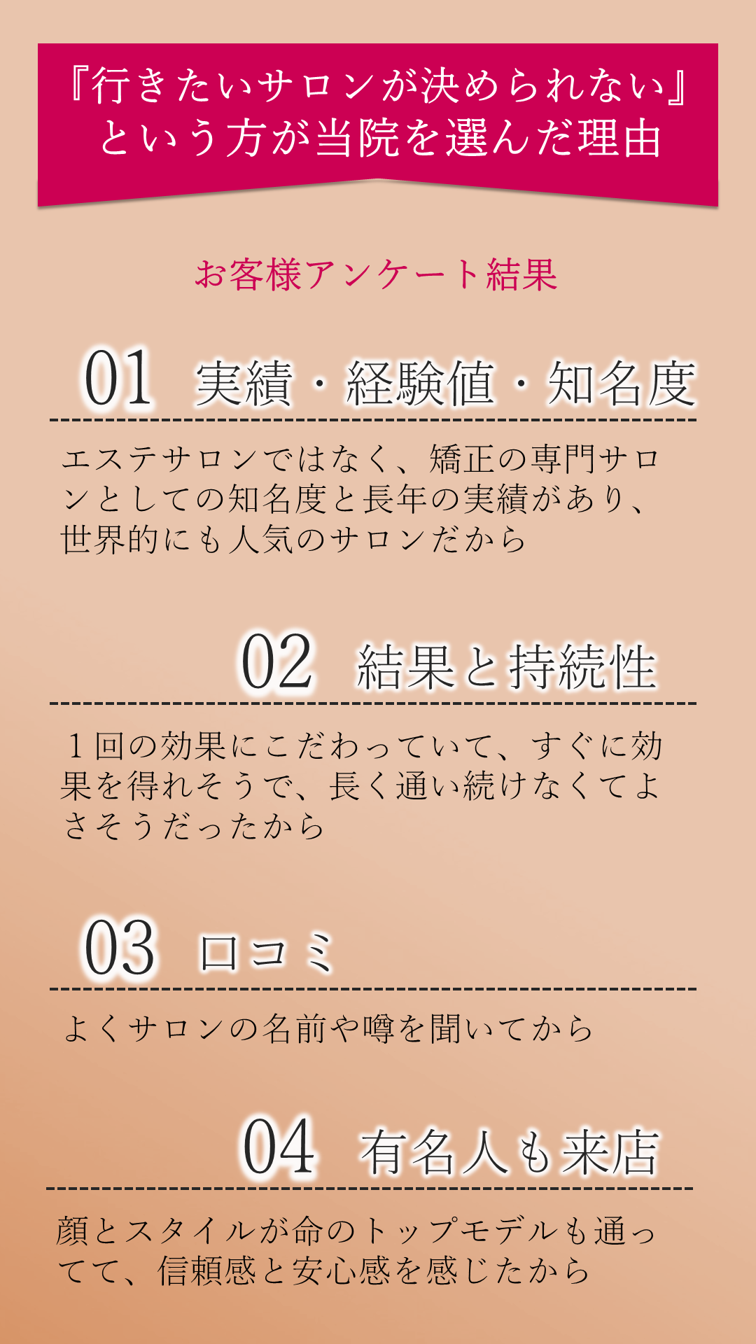 A..現在は法律により「戻らない」「半永久的」等の持続性ついての表現や、「小顔になる」「◯センチ小さくなる」等の施術効果についての表現、「骨を小さくする」「骨を動かす」「頭蓋骨矯正」の様に骨格の変化についての表現は法律で禁止されております。